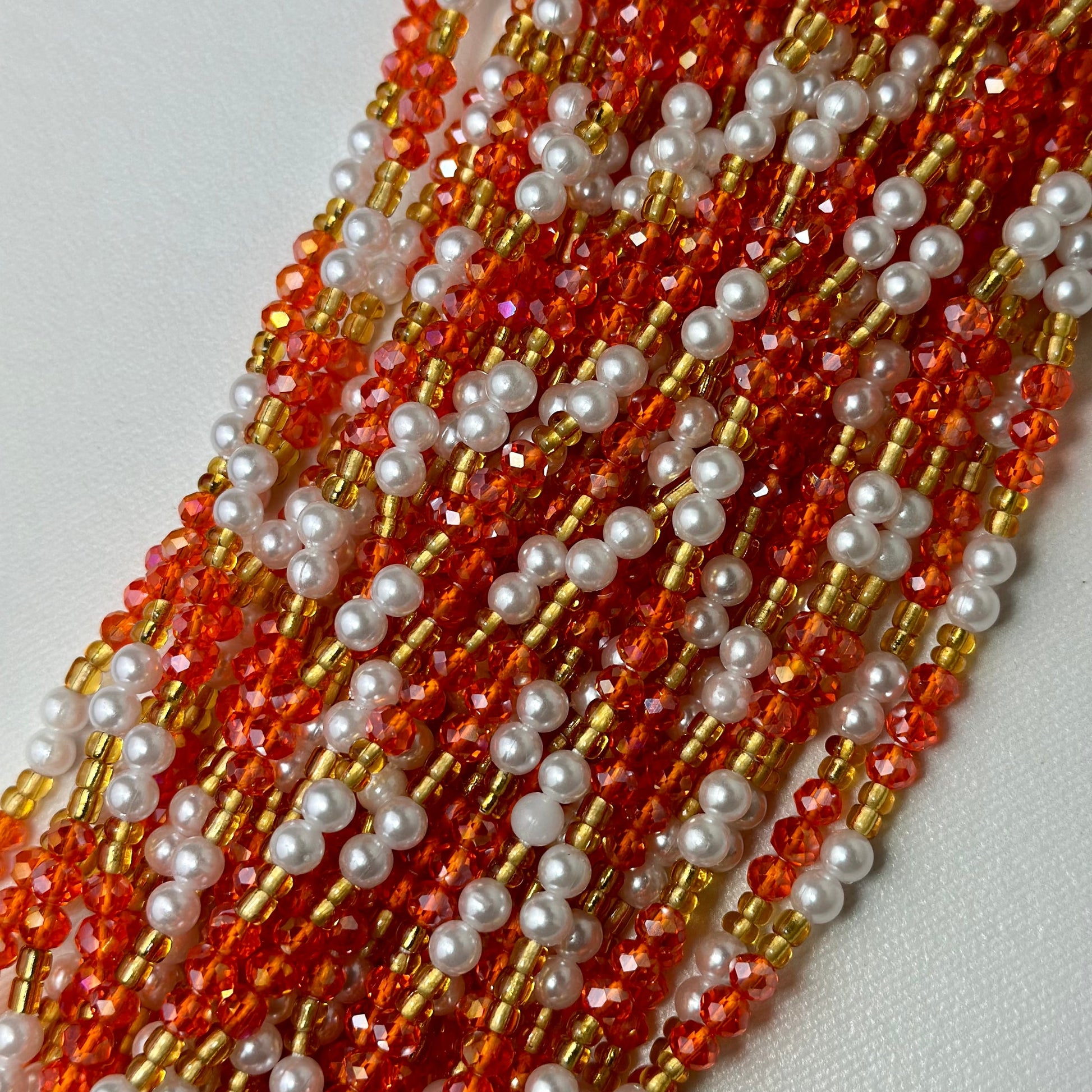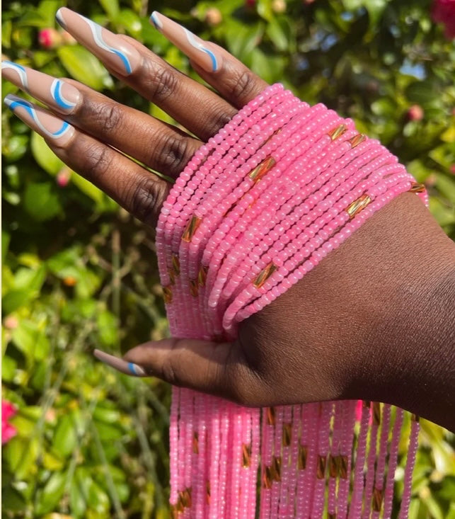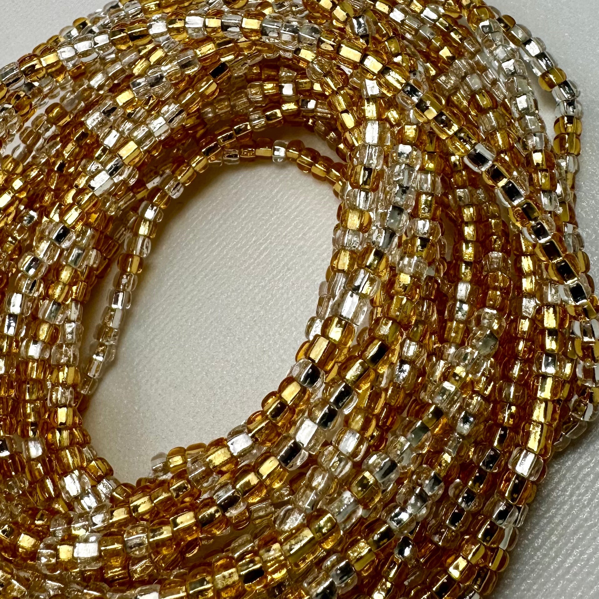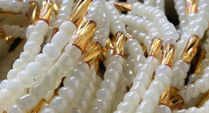 African waist beads may be made from glass, nuts, wood, or metal which are pierced, and hung on a string or threaded. They are often worn around the hips or waist. Our waist beads are made mainly with sand beads, seed beads, glass beads and crystal beads.